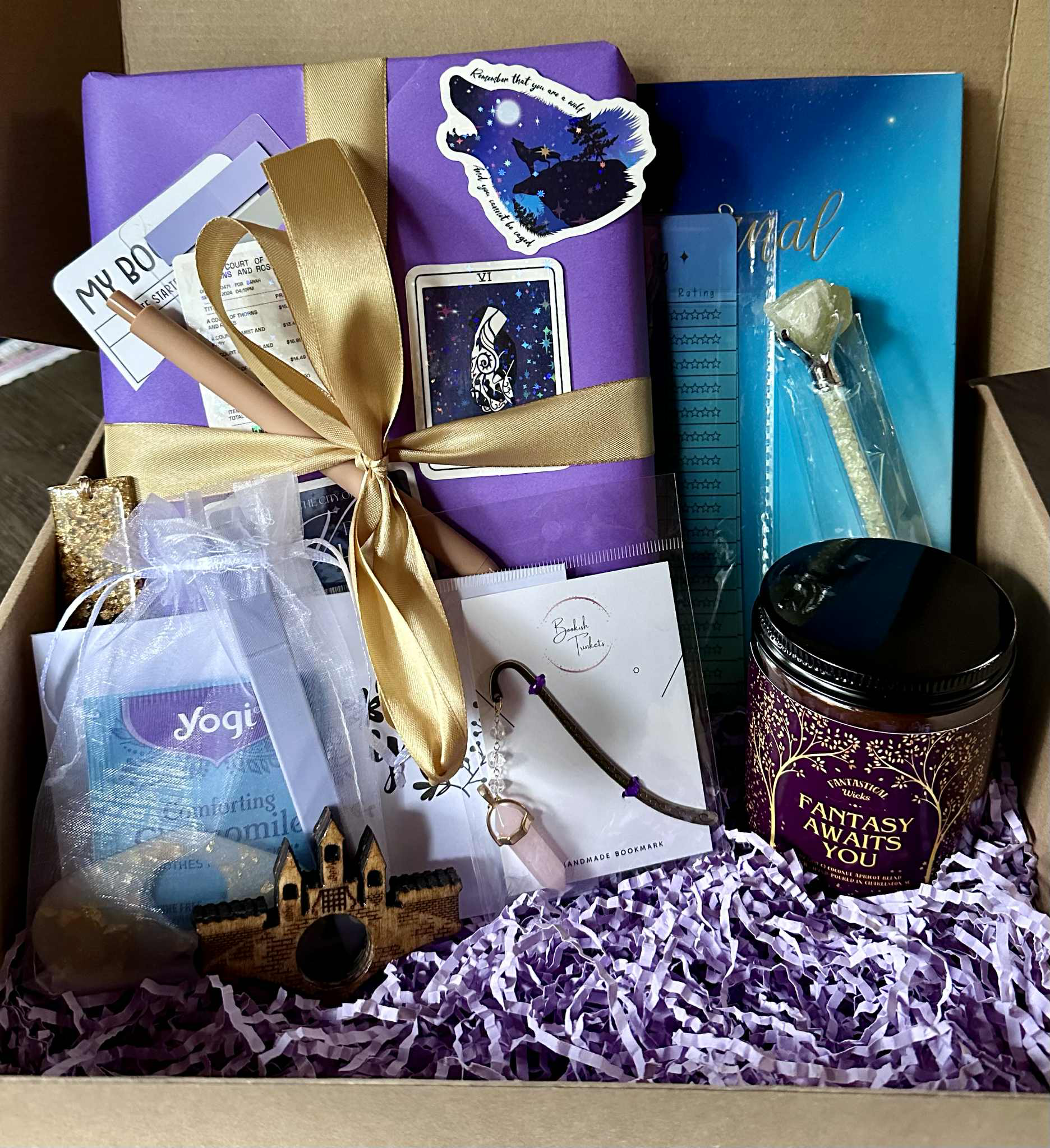 This fantasy themed book box includes a homemade bookmark, a homemade book page holder, a fantasy themed bookmark, a stone crystal pen, a journal, a fantasy castle finger page holder, and a soy wax fantasy candle.