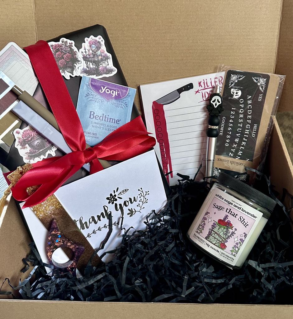 This horror genre themed book box includes a homemade bookmark, a homemade book page holder, a Ouija Board bookmark, a horror character pen, a killer notepad, and a soy wax candle.